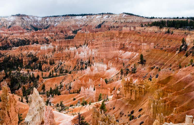 We travelled to Bryce from Death Valley and the contrast in climate couldn’t be more dramatic: baking hot to minus 2 deg C and snow! Bryce isn’t correctly speaking a canyon but a series of amphitheatres containing delicate and colourful pinnacles of rock called hoodoos formed by erosion.